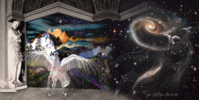 Pegusii soar on the currents of the vibration of Beethoven’s “Ode to Joy”, through the cosmos, to the portal of the material world.